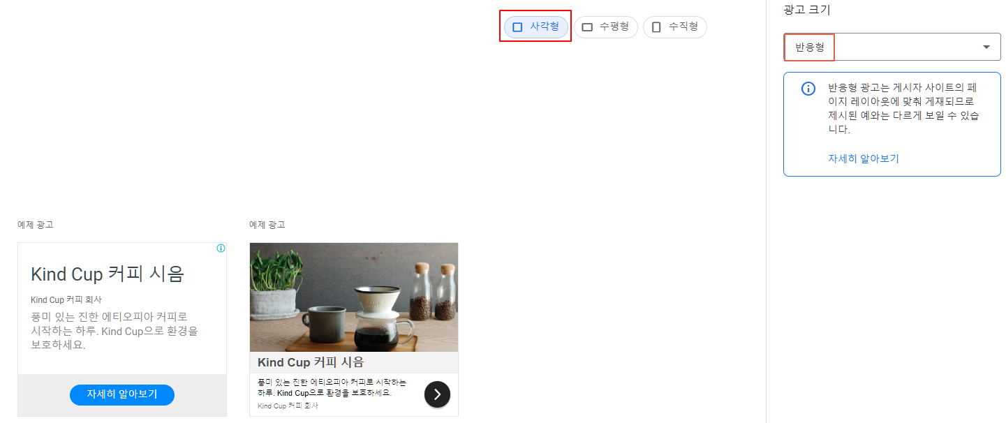 ※ 광고 크기는 "반응형"을 선택하도록 합니다.