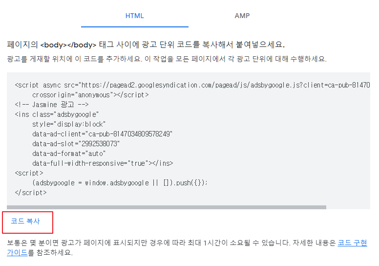 생성된 광고 단위에서, "<>" 모양을 보면 코드 가져오기를 보실 수 있습니다.