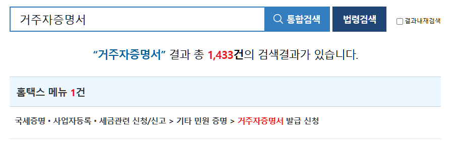 검색창에 "거주자 증명서" 타이핑 후 검색하면 아래처럼 발급 신청 란이 뜨게됩니다. 클릭합시다.