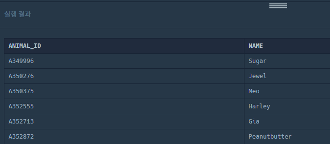 동물 보호소에 들어온 모든 동물의 아이디와 이름을 ANIMAL_ID순으로 조회하는 SQL문을 작성해주세요. SQL을 실행하면 다음과 같이 출력되어야 합니다.