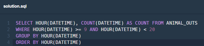 2. HOUR(DATETIME)이 9~20까지의 시간이 필요하므로 WHERE를 통해서 조건을 걸어줍니다