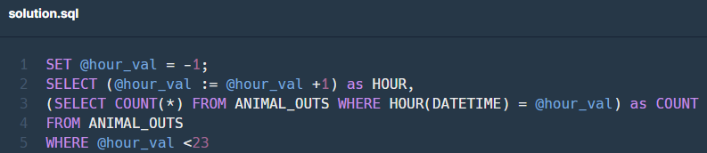 (SELECT COUNT(*) FROM ANIMAL_OUTS WHERE HOUR(DATETIME) = @hour_val) AS COUNT