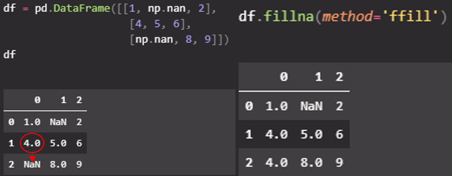 ■ df.fillna(method='ffill', axis=0) / default axis는 마찬가지로 0이다