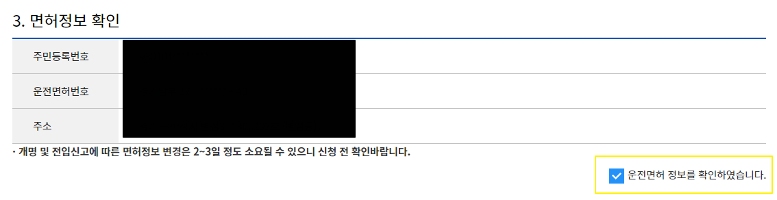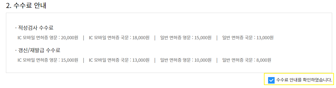 동의란, 수수료 확인란, 정보 확인란, 면허증 분실여부 확인란, 행정정보 공동 이용서 확인란 까지 5가지를 체크 해주도록 합니다.