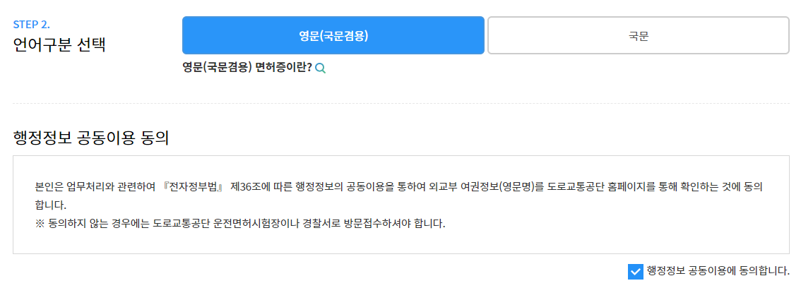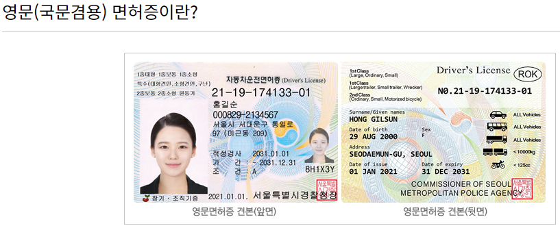 영문 선택 → 해외에서도 사용할 수 있도록 면허증 뒷면에 영문으로 표기가 되어 있습니다.