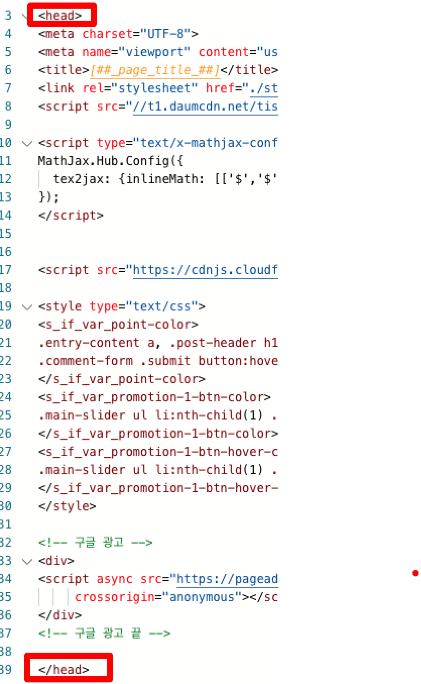 가져온 코드를 <head> ~ < /head> 사이에 넣어주도록 합니다.