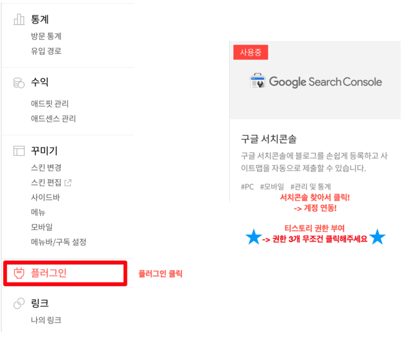 블로그 관리창에서, "플러그인"을 찾아 구글 서치 콘솔을 눌러줍니다.